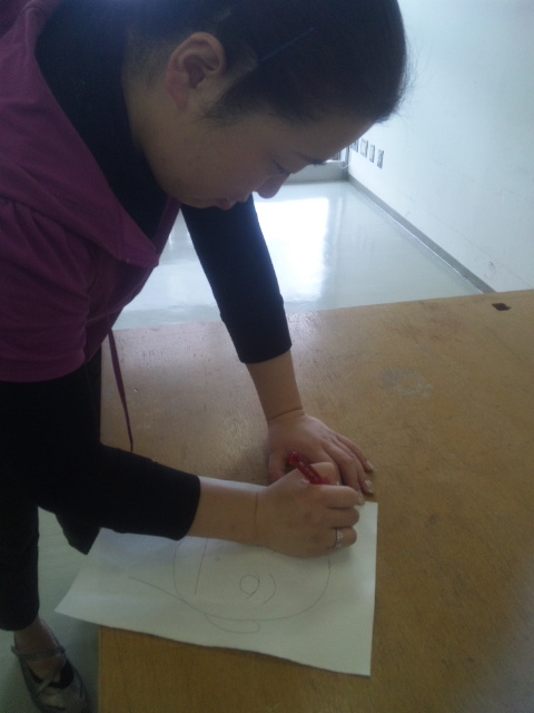 メイクプラン図を描いている、衣装メイク担当ミエ・タカサーキ。
